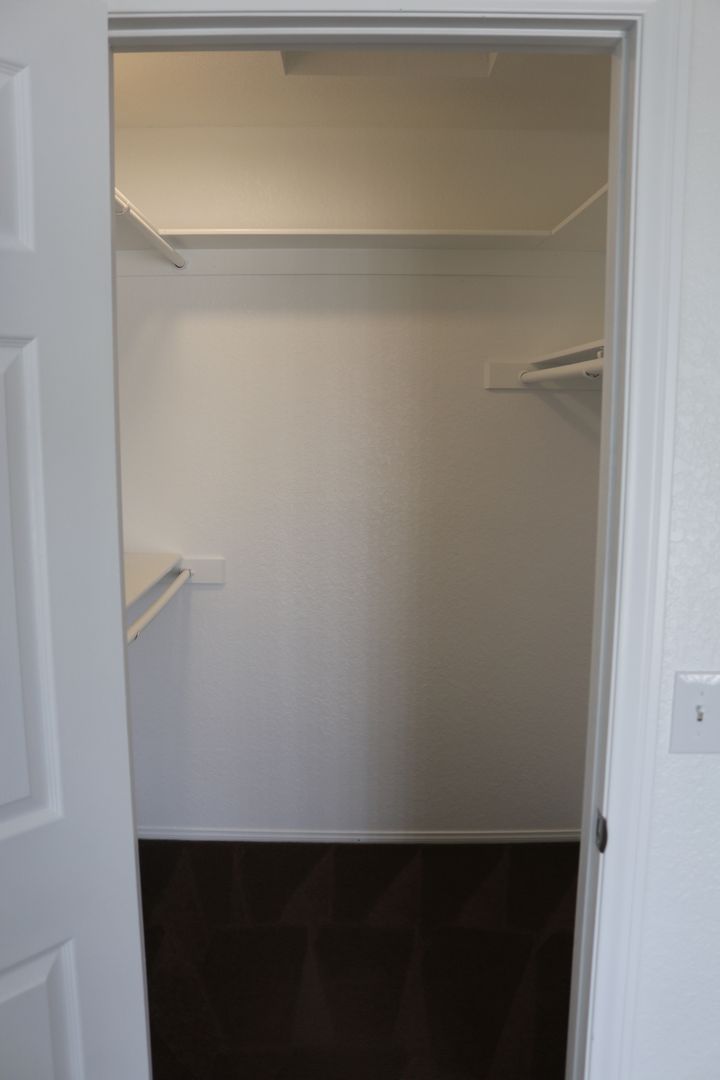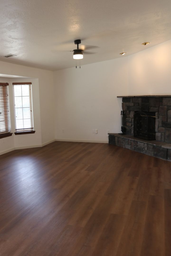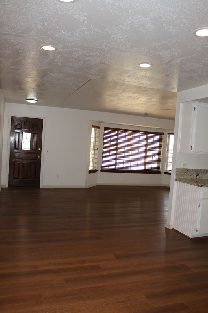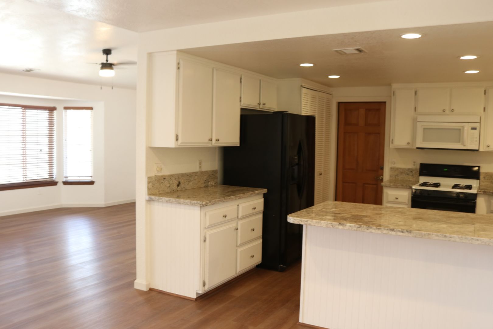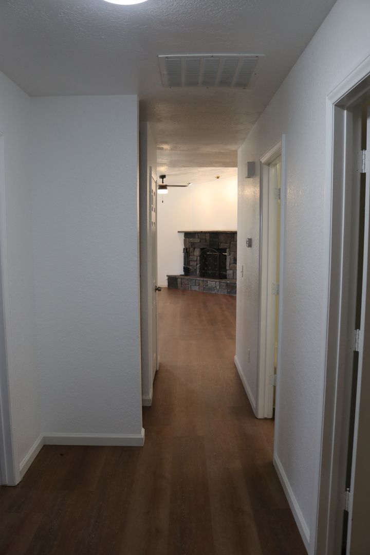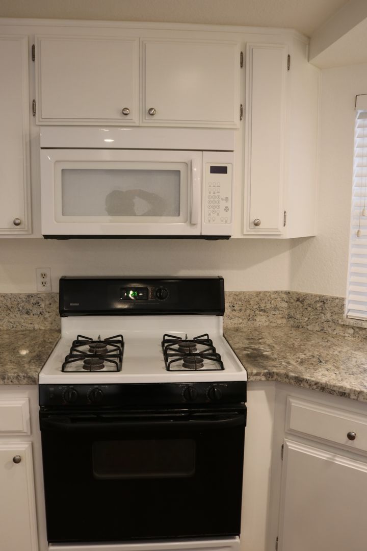 The kitchen boasts upgraded granite counters, white-painted cabinetry, a large pantry, and a convenient breakfast bar. The hallway leading to the bedrooms is extra wide, offering ample storage cabinets and a coat closet. The primary bedroom features a walk-in closet and a sliding door that grants access to the fenced backyard. The primary bathroom includes dual sinks and a spacious walk-in shower. Throughout the home, you'll find raised interior panel doors, wood laminate flooring, and cozy carpeting in the bedrooms.