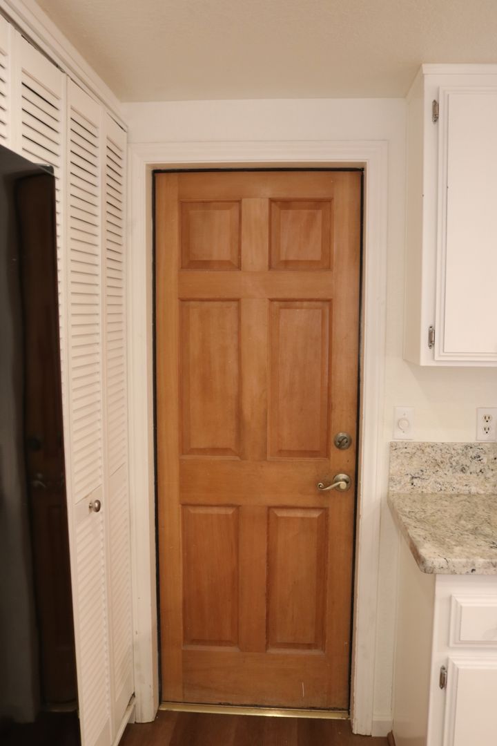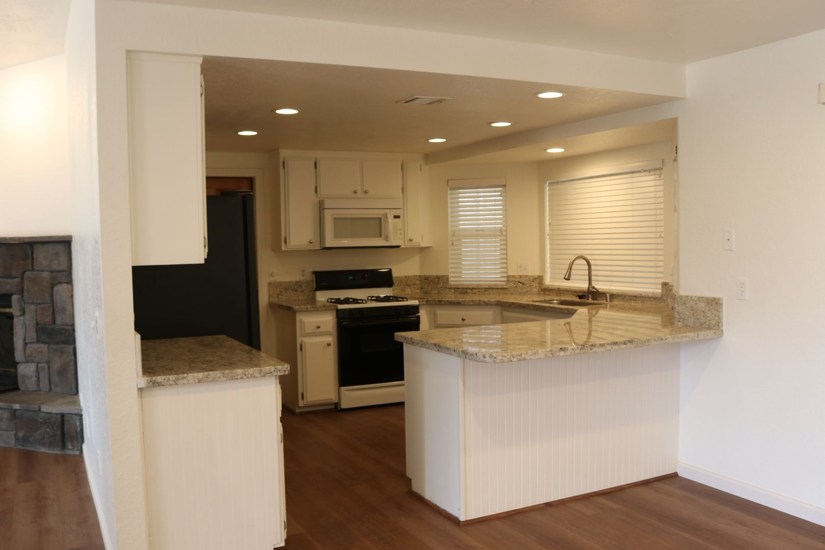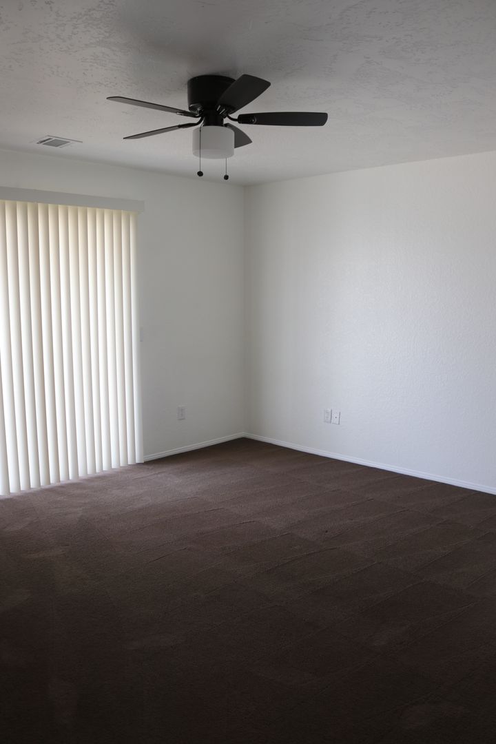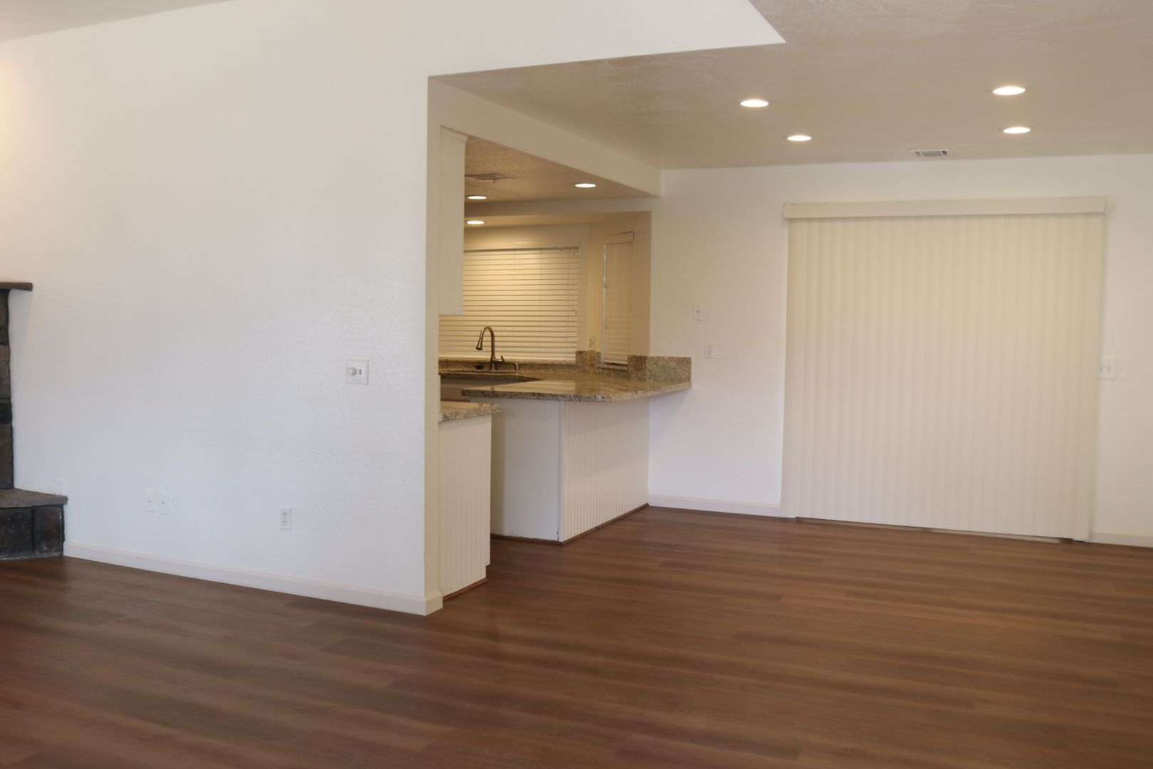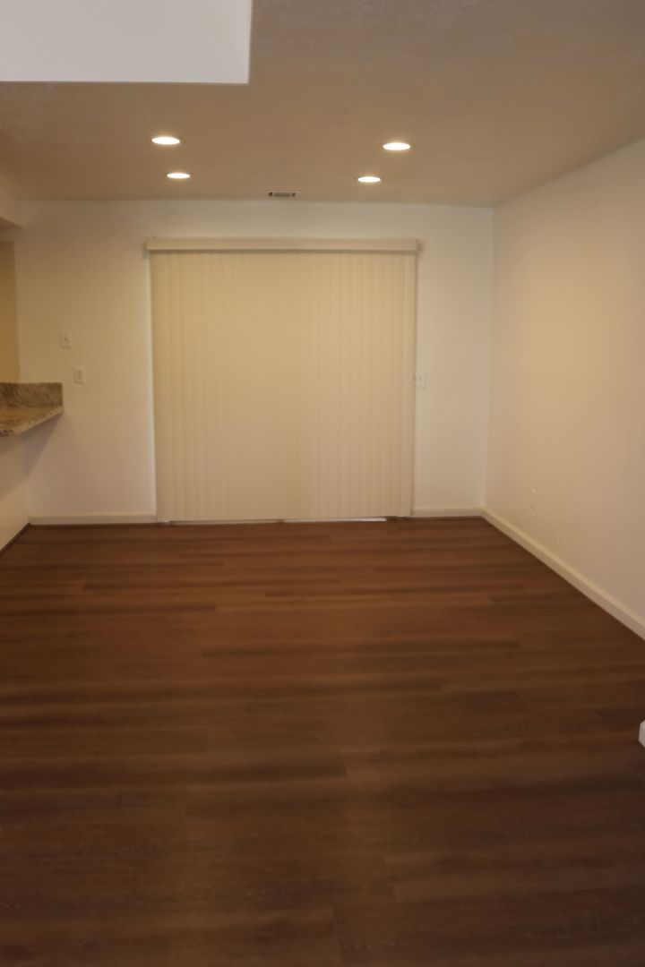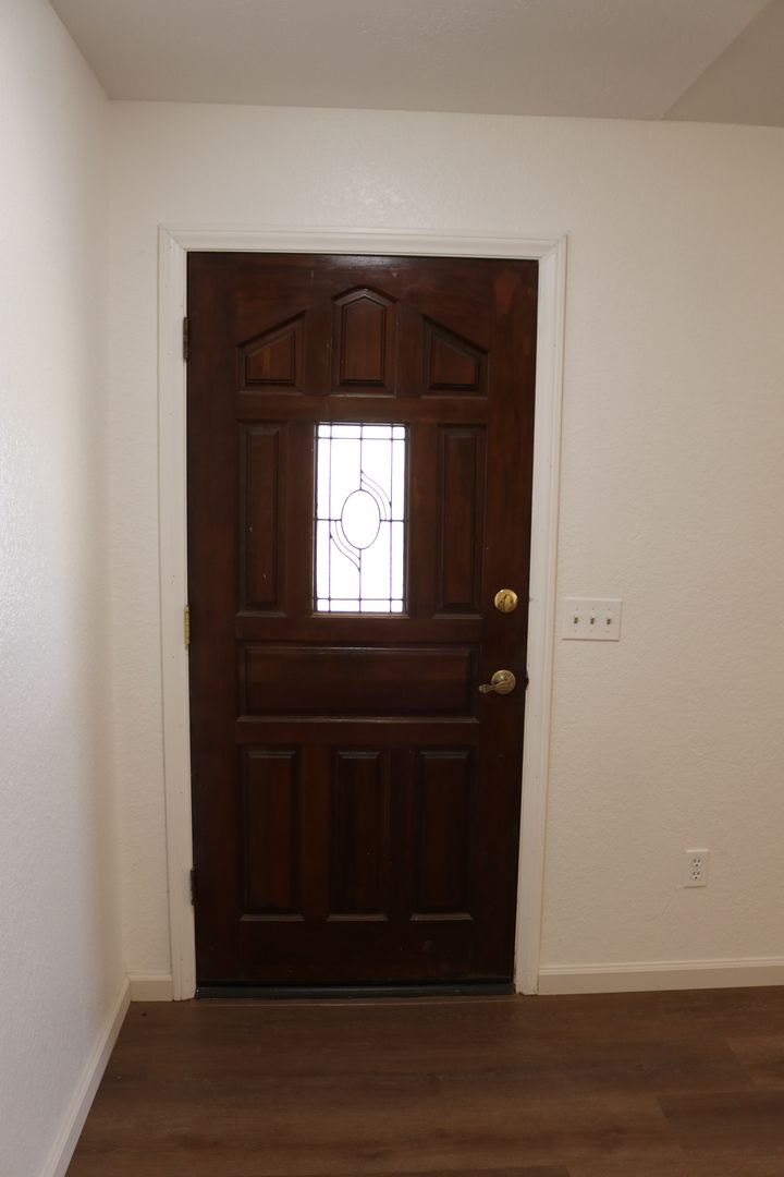 The kitchen boasts upgraded granite counters, white-painted cabinetry, a large pantry, and a convenient breakfast bar. The hallway leading to the bedrooms is extra wide, offering ample storage cabinets and a coat closet. The primary bedroom features a walk-in closet and a sliding door that grants access to the fenced backyard. The primary bathroom includes dual sinks and a spacious walk-in shower. Throughout the home, you'll find raised interior panel doors, wood laminate flooring, and cozy carpeting in the bedrooms.