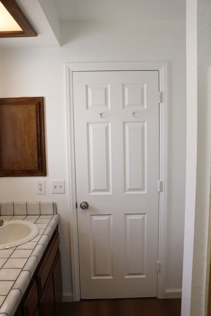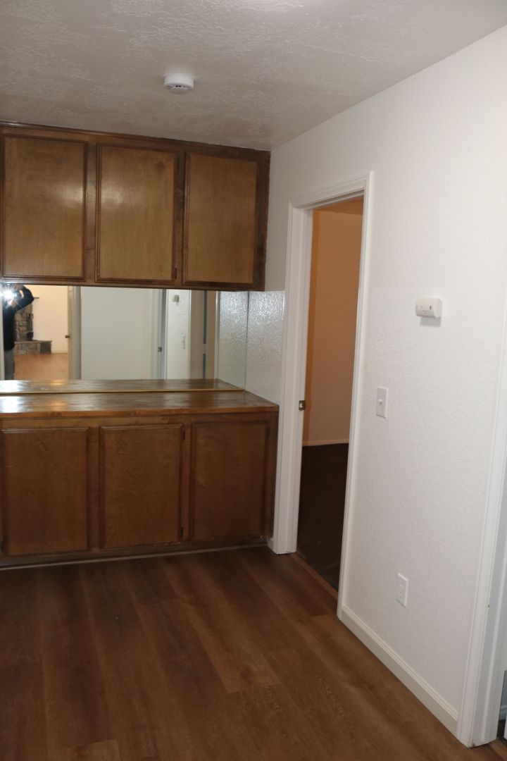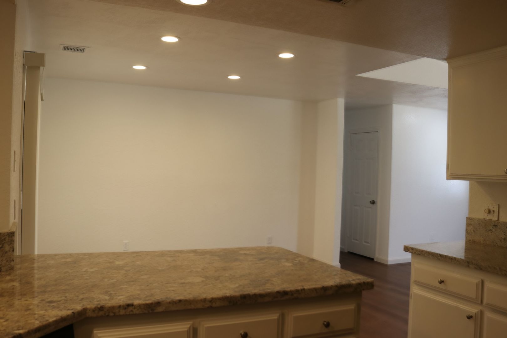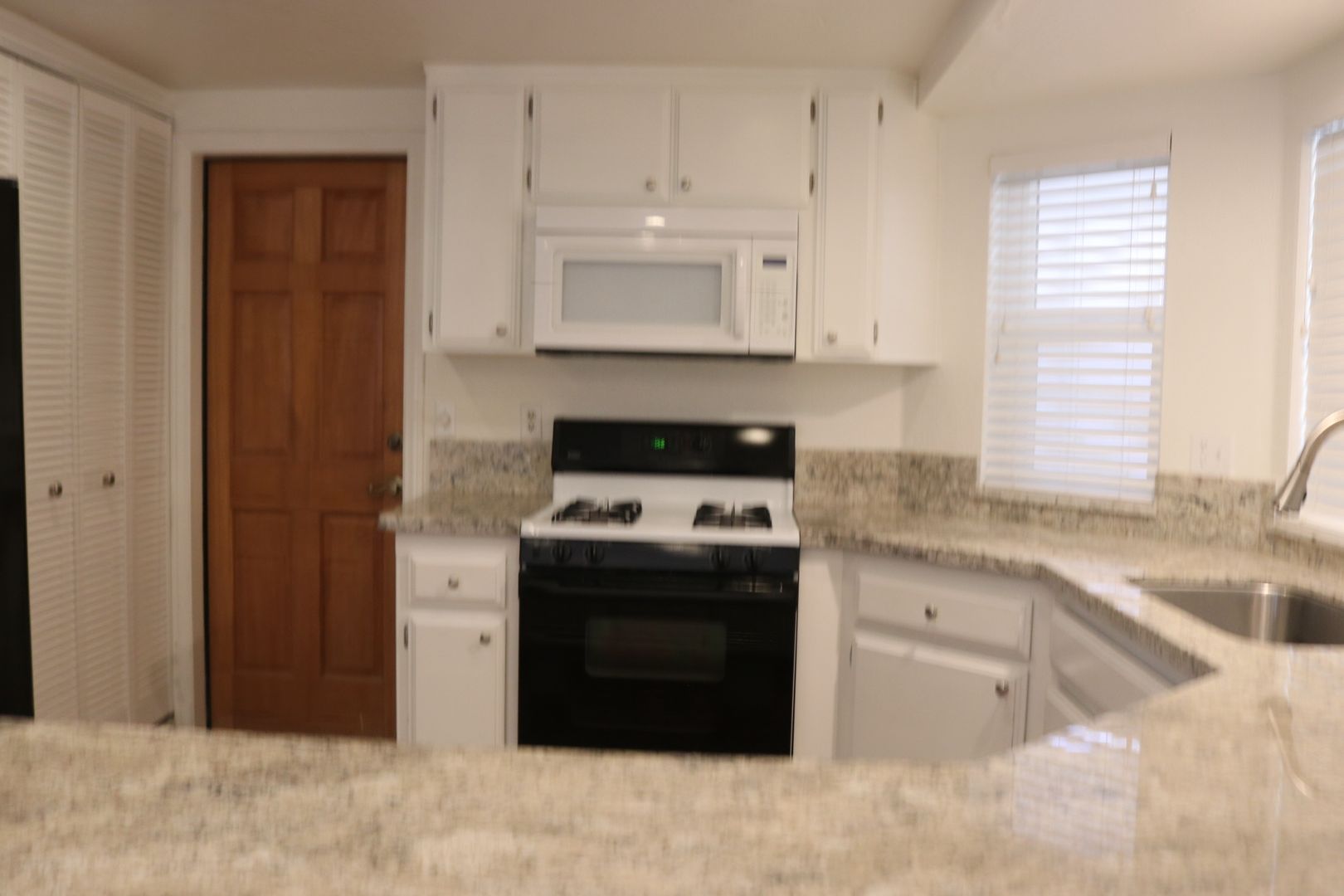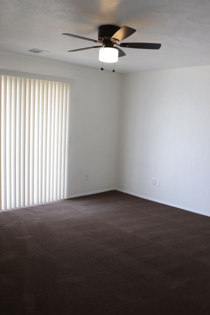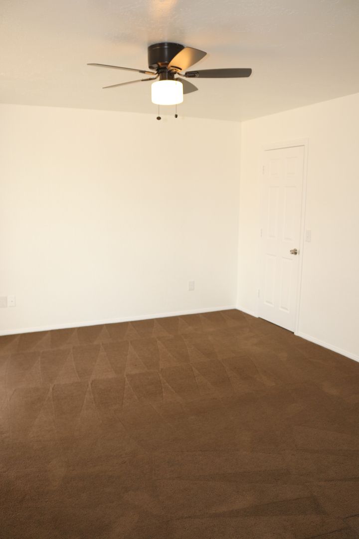 The kitchen boasts upgraded granite counters, white-painted cabinetry, a large pantry, and a convenient breakfast bar. The hallway leading to the bedrooms is extra wide, offering ample storage cabinets and a coat closet. The primary bedroom features a walk-in closet and a sliding door that grants access to the fenced backyard. The primary bathroom includes dual sinks and a spacious walk-in shower. Throughout the home, you'll find raised interior panel doors, wood laminate flooring, and cozy carpeting in the bedrooms.
