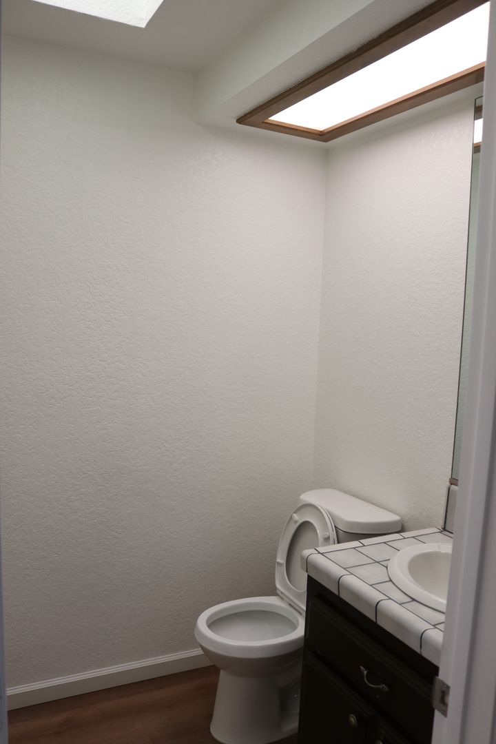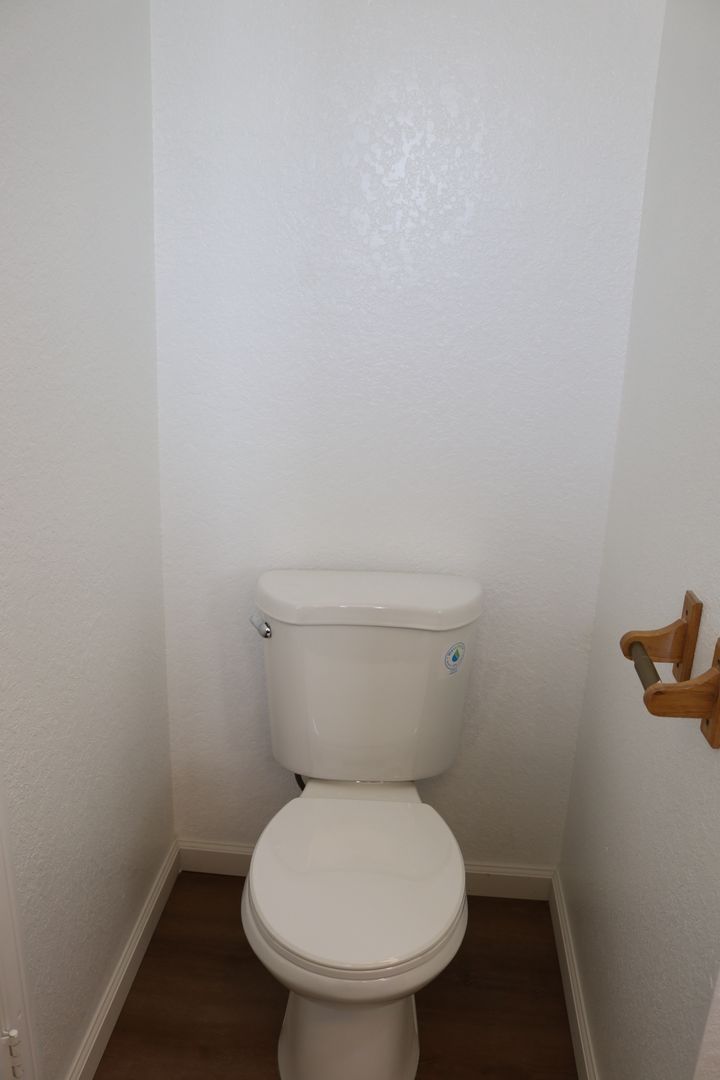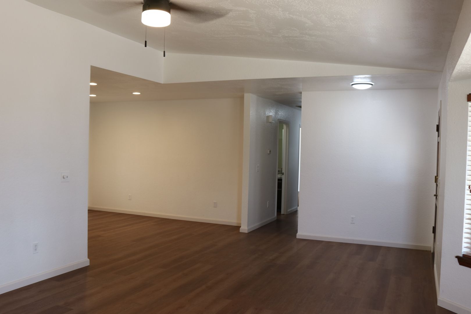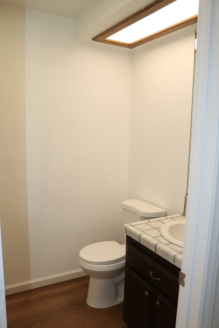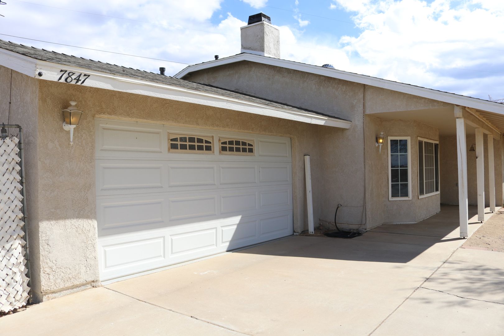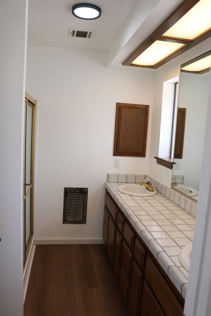 The kitchen boasts upgraded granite counters, white-painted cabinetry, a large pantry, and a convenient breakfast bar. The hallway leading to the bedrooms is extra wide, offering ample storage cabinets and a coat closet. The primary bedroom features a walk-in closet and a sliding door that grants access to the fenced backyard. The primary bathroom includes dual sinks and a spacious walk-in shower. Throughout the home, you'll find raised interior panel doors, wood laminate flooring, and cozy carpeting in the bedrooms.